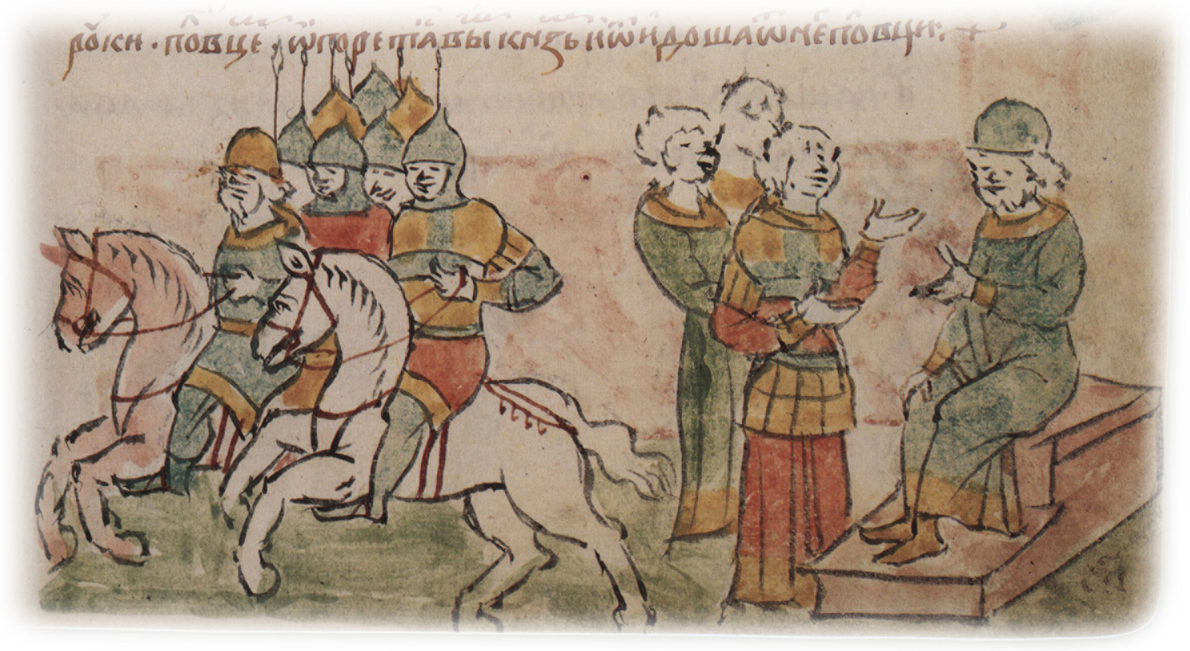 Рисунок "мастера В" — кисть и перо. Позднейшая пририсовка сбруи, стремян и древков копий — перо