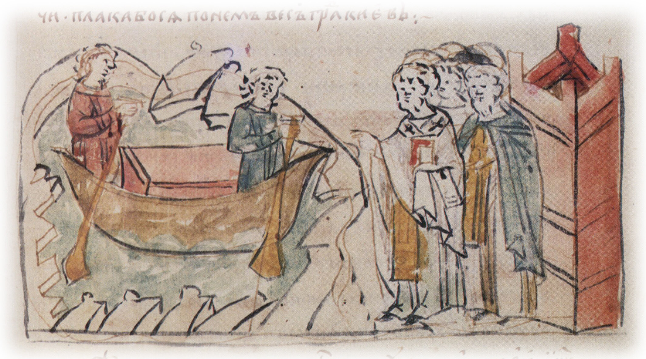 Привоз тела Изяслава Ярославича Киевского в ладье к Городцу; ветреча его киевлянами.