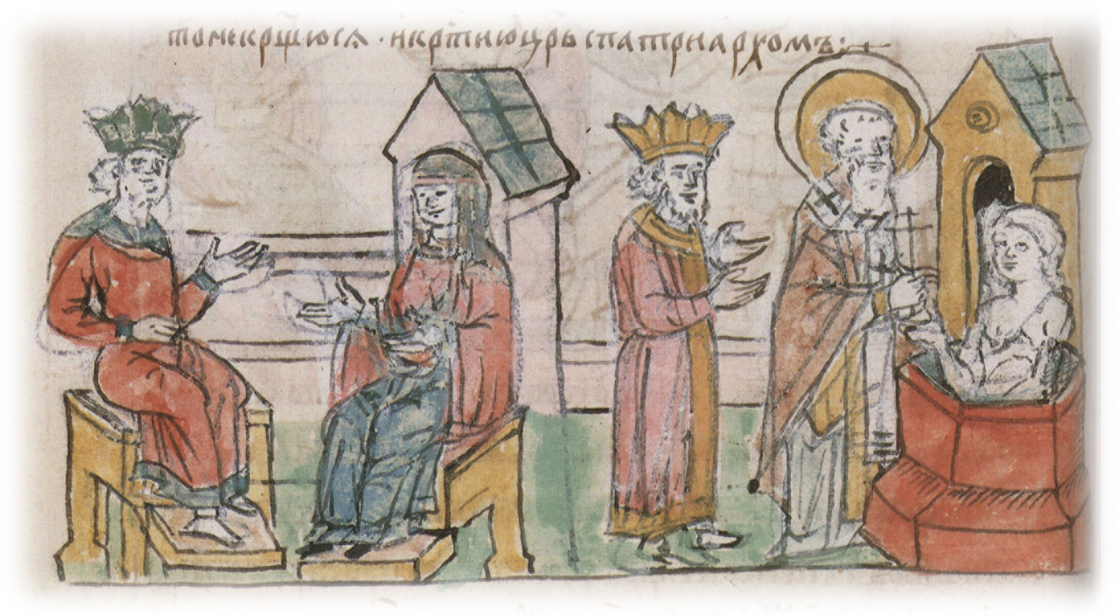 "В лето 6463. Иде Олга в Грекы, и прииде ко Царюграду. И бе тогда царь Костянтин сын Леонов; и прииде к нему Олга, и видев ю добру сущу зело лицем и смыслену, и удивися царь разуму еа, и беседуа рек к ней: «Подобна еси царствовати...» Она же разумевши, рече ко царю: «Аз погана есми. Аще мя хощешь крестити, крести мя сАмосов А. А. О пространственном построении миниатюр Радзивиловской летописи // Общественное сознание, книжность, литература периода феодализма. К 60-летию со дня рождения член- корр. Н. Н. Покровского. Сб. науч. тр. Новосибирск, 1990. С. 89—93. Аще ли, то не крещюся». И крести ю царь с патриархом".