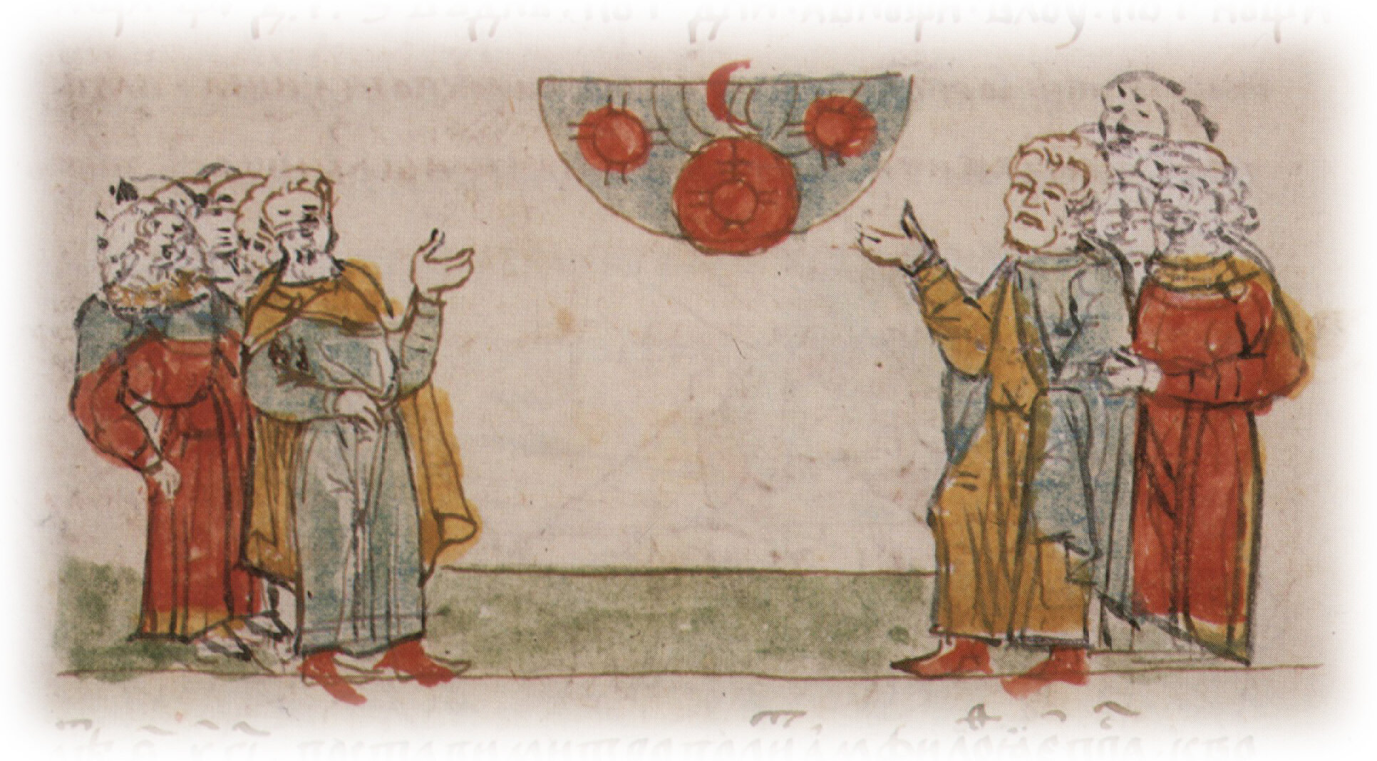"В се же лето бысть знамение: стояше солнце в крузе, а посреде круга крест, а посреде креста солнце, а вне круга обаполы 2 солнца, а над солнцем, кроме круга, дута рогома на север; тако же знамение и в луне тем же образом".