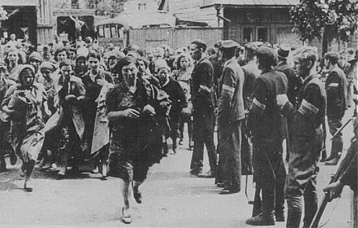 Литовские повстанцы сгоняют еврейских женщин к месту расстрела. Каунас.