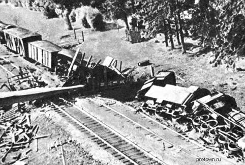 Железнодорожный состав, подорванный партизанами. Литва, 1944 г.