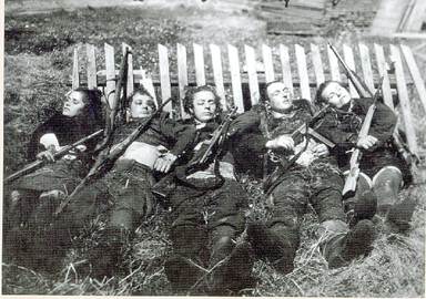 Убитых «лесных братьев» фотографировали с оружием для предъявлениясудебным органам. 1945 г.