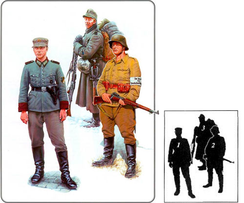 1. Унтер-офицер эстонского полицейского батальона, 1943 г. 2. Боец эстонской самообороны («Омакайтсе»), 1942 г. 3. Гренадер 45-го полка 20-й Эстонской дивизии СС, 1945 г. Дата создания:Реконструкция 2000 г. по фотографиям 1941 – 1945 гг.