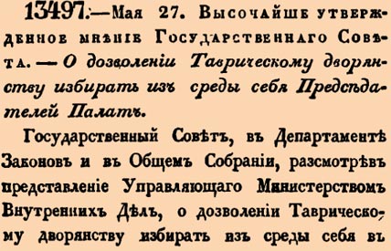 13497. 1840 год. 8 июня (27 мая ст.ст.). Высочайше утвержденное мнение Государственнаго Совета. О дозволении Таврическому дворянству избирать из среды себя Председателей Палат.Государственный Совет, в Департаменте Законов и в Общем Собрании, разсмотрев представление Управляющаго Министерством Внутренних Дел, о дозволении Таврическому дворянству избирать из среды себя в должности Председателей Палат <…>