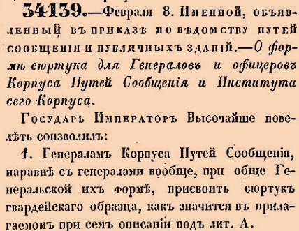34139. 1859 год. 8 февраля (20 февраля). Именной, объявленный в приказе по ведомству путей сообщения и публичных зданий. О форме сюртука для Генералов и офицеров Корпуса Путей Сообщения и Института сего Корпуса.
