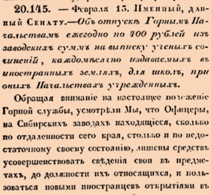 Закон № 20145. 1802 год. 13 февраля (25 февраля). Именной указ о выделении средств Горным начальствам на приобретение научной литературы, инструментов и периодических изданий для профессионального развития офицеров и нужд заводских школ.