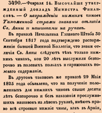 Закон № 3490. 1830 год. 14 февраля (26 февраля).О распространении права на получение знаков отличия Святой Анны и нашивок за беспорочную службу на нижних чинов Таможенной стражи с установлением порядка пенсионных выплат.