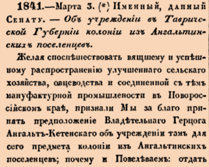 1841. 1828 год. 15 марта (3 марта ст.ст.) Именный, данный Сенату. Об учреждении в Таврической Губернии колонии из Ангальтинских поселенцев.Желая споспешествовать вящшему и успешному распространению улучшеннаго сельскаго хозяйства, овцеводства и соединенной с тем мануфактурной промышленности в Новороссийском крае, признали Мы за благо принять предположение Владетельнаго Герцога Ангальт-Кетенскаго об учреждении там для сего предмета колонии из Ангальтинских поселенцев <…>