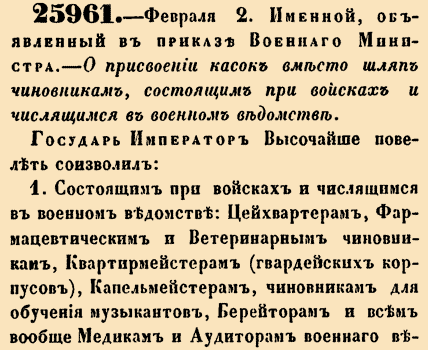 25961. Именной, объявленный в приказе Военного Министра. 14 Февраля (2 по ст.ст.) 1852 года.О присвоении касок вместо шляп чиновникам, состоящим при войсках и числищимся в военном ведомстве.Государь Император Высочайше повелеть соизволил: 1. Состоящим при войсках и числищимся в военном ведомстве: Цейхвартерам, Фармацевтическим и Ветеринарным чиновникам, Квартирмейстерам (гвардейских корпусов), Капельмейстерам, чиновникам для обучения музыкантов, Берейторам и всем вообще Медикам и Аудиторам военного ведомства, вместо шляпы, иметь каску без султана, с прибором по цвету пуговиц: а) для состоящих при войсках гвардии — с гвардейским гербом; б) для состоящих: при войсках армии, при Департаментах Военного Министерства, при военных госпиталях, гарнизонных батальонах и других местах — с армейским гербом, имеющим гладкий щит<...>