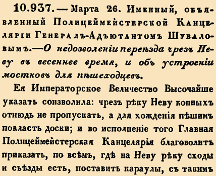 О недозволении переезда чрез Неву в весеннее время, и об устроении мостиков для пешеходов