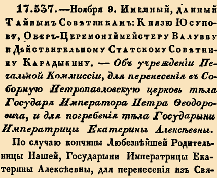 Закон № 17.537 — 1796 год 9 ноября (20 ноября). Указ об учреждении Печальной комиссии для организации совместного погребения императора Петра III и императрицы Екатерины II.