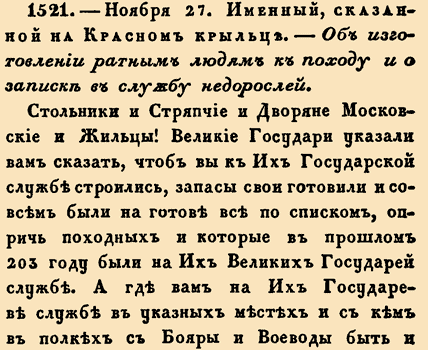 1521. Именный, сказанный на Красном крыльце. 27 ноября 1695 года.Об изготовлении ратным людям к походу и о записи в службу недорослей.Стольники и Стряпчие и Дворяне Московские и Жильцы! Великие Государи указали вам сказать, чтоб вы к Их Государской службе строились, запасы свои готовили и совсем были на готове все по списком, опричь походных и которые в прошлом 203 году были на Их Великой Государей службе. А где вам на Их Государевой службе в указных местах и с кем в полках с Бояры и Воеводы быть и на которые указные сроки стать, и о том вам Их Великих Государей указ сказан будет и имена ваши прочтены будут вскоре. А которые у вас же Московских чинов людей дети и братья и племянники и иные свойственники в возратсе и в полковую службу поспели, и вы бы их писали в чины в службу, и били челом об них в Разряде ныне вскоре ж, не укрывая никого