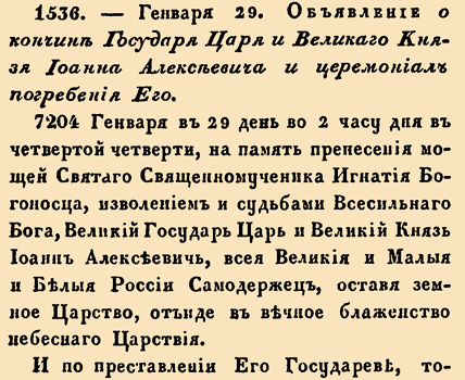 1536. Объявление. 29 января 1696 года.О кончине Государя Царя и Великого Князя Иоанна Алексеевича и церемониал погребения Его.7204 Января в 29 день во 2 часу дня в четверти, на память пренесения мощей Святого Священномученика Игнатия Богоносца, изволением и судьбами Всесильного Бога, Великий Государь Царь и Великий Князь Иоанн Алексеевич, всея Великая и Малая и Белая России Самодержец, оставя земное Царство, отныне в вечное блаженство небесного Царствия.И по преставлении Его Государеве, того ж числа Иммеретинский и Касимовский и Сибирские Царевичи и Бояре и Окольничие и Думные и Ближние люди и Стольники, и Стряпчие, и Дворяне, и Дьяки, и Жильцы, и разных строев Генералы и Полковники, и подполковники, и начальные люди, и городовые Дворяне, и дети Боярские, и Гости и дворовые люди, в Его Государевых хоромах, прося у Него Государя прощения, целовали Его Государеву руку