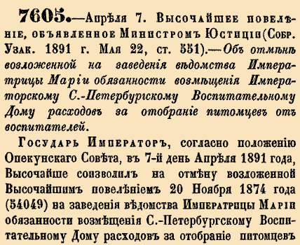 7605. Апреля 7. Высочайшее повеление, объявленное Министром Юстиции, 1891 год.Об отмене возложенной на заведения ведомства Императрицы Марии обязанности возмещения Императорскому С.-Петербургскому Воспитательному Дому расходов за отобрание питомцев от воспитателейГосударь Император, согласно положению Опекунского Совета, в 7-й день апреля 1891 года, Высочайше соизволил на отмену возложенной Высочайшим повелением 20 мНоября 1874 года на заведения ведомства Императрицы Марии обязанности возмещения С.-Петербургскому Воспитательному Дому расходов за отобрание питомцев от воспитателей в тех случаях, когда питомцы отбираются от воспитателей против их желания и не по их вине.