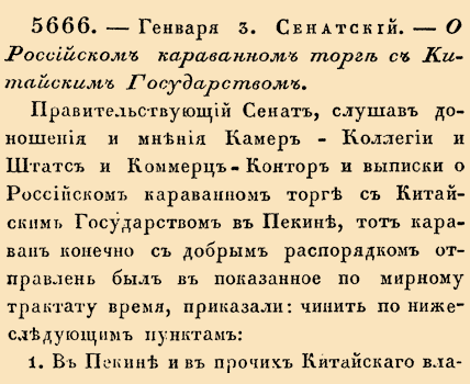 5666. — Января 3. Сенатский, 1731 год.О Российском караванном торге с Китайским ГосударствомПравительствующий Сенат, слушав доношения и мнения Камер-Коллегии и Штатс и Коммерц-Контор и выписки о Российском караванном торге с Китайским Государством в Пекине, тот караван конечно с добрым распорядком отправленбыл в показанное по мирному трактату время, приказали: чинить по нижеследующим пунктам:1. В Пекине и в прочих Китайского владения местах никому Российским подданным всякого чина и звания людям ни под каким претекстом, ни причиною, мягкою рухлядью, кроме казенной такой мягкой рухляди, с караваном в Пекин посылаемой, не торговать и за границу ни тайно, ни явно не отпускать, под потерянием всех таких товаров, дабы оный торг, чрез удержание излишней мягкой рухляди, паки привесть в первое достоинство к Государственной прибыли, и о том публиковать во всех Сибирских городах печатными указами.