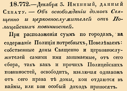 18.772. — 14 декабря (3 декабря по ст.ст.). Именный, данный Сенату, 1798 год.Об освобождении домов Священно и церковнослужителей от Полицейских повинностей.При расположении сумм по городам, на содержание Полиции потребных, Повелеваем: собственные домы Священно и церковнослужителей самими ими занимаемые, от сего сбора, так как и прочих Полицейских повинностей, освободить, исключая однакож от сего права те домы, кои отдаются в наймы, или кои особый доход приносят.
