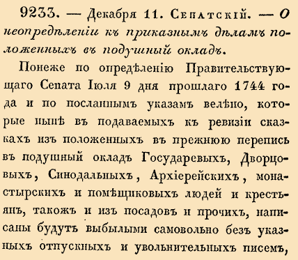 Закон № 9233. 1745 год. 11 декабря (22 декабря). Запрет на определение крестьян и посадских в приказные чины без отпускных документов.