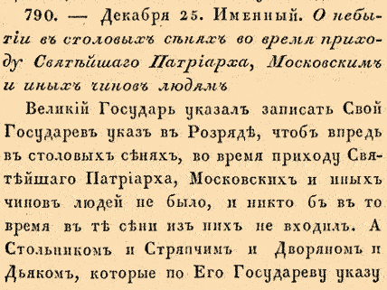 Закон № 790. 1679 год. 25 декабря (4 января 1680 г.). Запрет на нахождение в столовых сенях придворных чинов во время прибытия Патриарха.