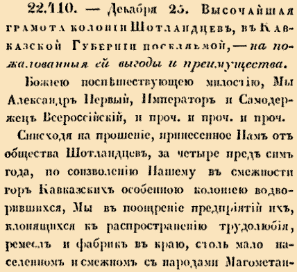 Высочайшая грамота колонии Шотландцев, в Кавказской губернии поселяемой – на пожалованныя ей выгоды и преимущества.