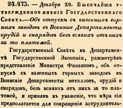 Закон № 24473. 1810 год. 29 декабря (10 января 1811 года). О безвозмездной поставке военной продукции с казенных горных заводов
