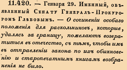 Закон № 11420. - 1762 год. 29 января (9 февраля). Распоряжение о подготовке нормативного акта, разрешающего возвращение беглых старообрядцев из-за границы с правом свободного вероисповедания и поселения в Сибири.