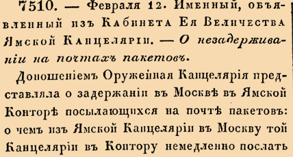 Закон № 7510. 1738 год. 12 февраля (23 февраля). Указ о запрете задержек служебной корреспонденции Оружейной канцелярии в Московской ямской конторе.