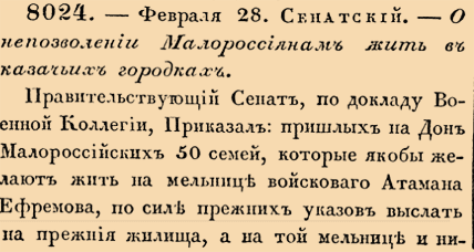Закон № 8024. 1740 год. 28 февраля (11 марта). Указ Правительствующего Сената о запрете выходцам из Малороссии и беглым азовским работникам селиться на территории Войска Донского и об установлении процедуры их возвращения прежним владельцам.