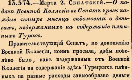 13574. 1771 год. 2 марта (13 марта). О подаче Военной Коллегии в Сенате чрез каждые четыре месяца ведомости л деньгах, издержанных на содержание пленных Турок.