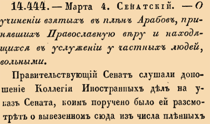 14444. 1776 год. 15 марта (4 марта ст.ст.) Сенатский. О учинении взятых в плен Арабов, принявших Православную веру и находящихся в услужении у частных людей, вольными.Правительствующий Сента слушали доношение Коллегии Иностранных дел на укаp Сената, коими поручено было ей разсмотреть о вывезенном сюда из числа пленных во флоте Адмиралом Спиридовым Арабе, и по крещении в веру Греческаго исповедания, отданном от него брату его Генералу-Поручику Спиридову