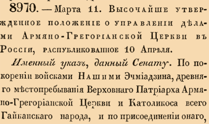 8970. 1836 год. 23 марта (11 марта ст.ст.). Высочайше утвержденное положение о управлении делами Армяно-Грегорианской Церкви в России, распубликованное 10 апреля.Именный указ, данный Сенату. По покорении войсками Нашими Эчмиадзина, древняго местопребывания Верховнаго Патриарха Армяно-Грегорианской Церкви и Католикоса всего Гайканскаго народа <…>