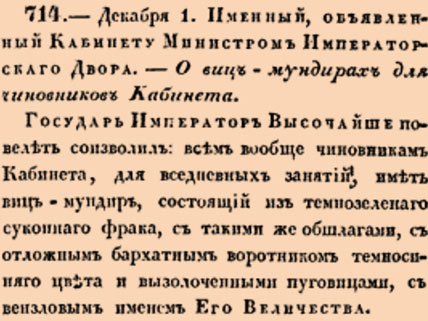 714. 1826 год. 1 декабря (13 декабря). Именный, объявленный Кабинету Министром Императорскаго Двора. О виц-мундирах для чиновников Кабинета.