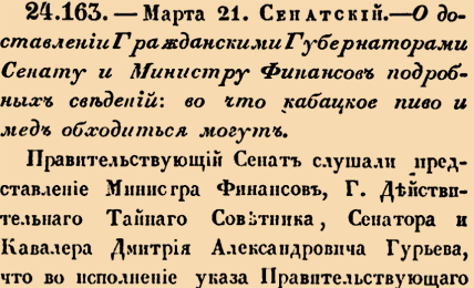 24163. 1810 год. 2 апреля (21 марта ст.ст.) Сенатский. О доставлении Гражданскими Губернаторами Сенату и Министру Финансов подробных сведений: во что кабацкое пиво и мед обходиться могут