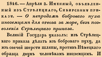 1846. 1701 год. 13 апреля (2 апреля ст.ст.) Именный, объявленный из Стрелецкаго, Сибирскому приказу. О непродаже боброваго пуха иноземцам для отвоза за море, без позволения Стрелецкаго приказа.Великий Государь указал: из Стрелецкаго приказа делать из боброваго пуху, да из овечей шерсти шляпы, против Немецкаго образца двум человекам иноземцам <…>