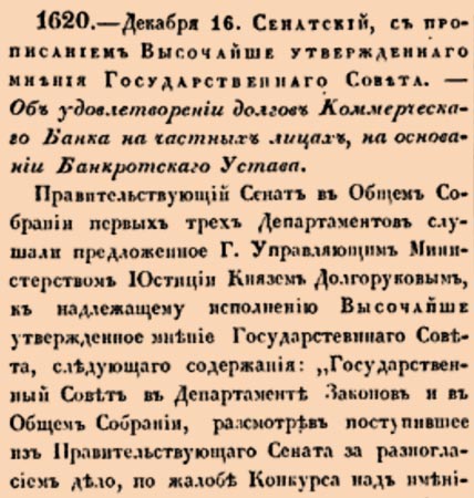 1620. 1827 год. 28 декабря (16 декабря ст.ст.) Сенатский, с прописанием Высочайше утвержденного мнения Государственнаго Совета. Об удовлетворении долгов Коммерческаго Банка на частных лицах, на основании Банкротскаго Устава.Правительствующий Сенат в Общем Собрании первых трех Департаментов слушали предложенное Г.Управляющим Министерством Юстиции Князем Долгоруким, к надлежащему исполнению Высочайше утвержденное мнение Государственнаго Совета <…>