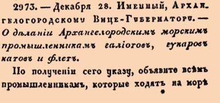 2973. 1715 год. 8 января (28 декабря ст.ст.) Архангелогородскому Вице-Губернатору. О делании Архангелогородским морским промышленникам галиотов, гунаров, катов и флет.По получении сего указу, объявите всем промышленникам, которые ходят на море для промыслов своих на ладьях и на кочах, дабы они вместо тех судов делали морские суда