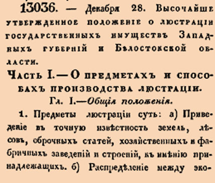 13036. 1839 год. 9 января (28 декабря ст.ст.) Высочайше утвержденное положение о люстрации государственных имуществ Западных губерний и Белостокской области.Часть I. О предметах и способах производства люстрации. 1.Предметы люстрации суть: а) Приведение в точную известность земель, лесов, оброчных статей, хозяйственных и фабричных заведений и строений, к имению принадлежащих <…>