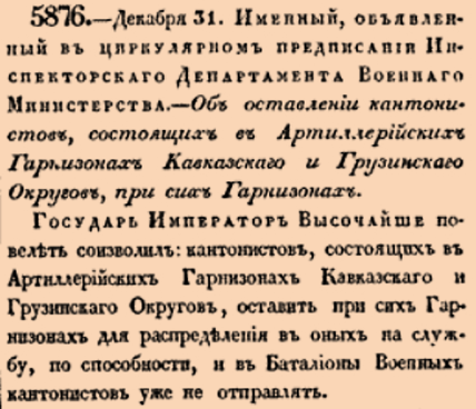 Закон № 5876. 1832 год. 31 декабря (12 января 1833 года). О распоряжении оставлять кантонистов Кавказского и Грузинского округов на местной службе в артиллерийских гарнизонах.