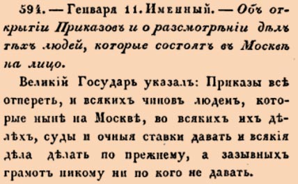 Закон № 594. 1675 год. 11 января (21 января). Указ о возобновлении работы приказов в Москве и проведении судов для присутствующих в городе лиц.