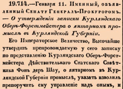 19714. 1801 год. 23 января (11 января ст.ст.) Именный, объявленный Сенату Генерал-Прокурором. О утверждении записки Курляндскаго Обер-Формейстера о янтарном промысле в Курляндской Губернии.Его Императорское Величество, Высочайше утвердив препровождаемую у сего записку по представлению Курляндскаго Обер-Форстмейстера Действительнаго Статскаго Советника Фон дер Шау, о янтарном в Курляндской Губернии промысле, указать изволил препоручить ему управление над оным <…>