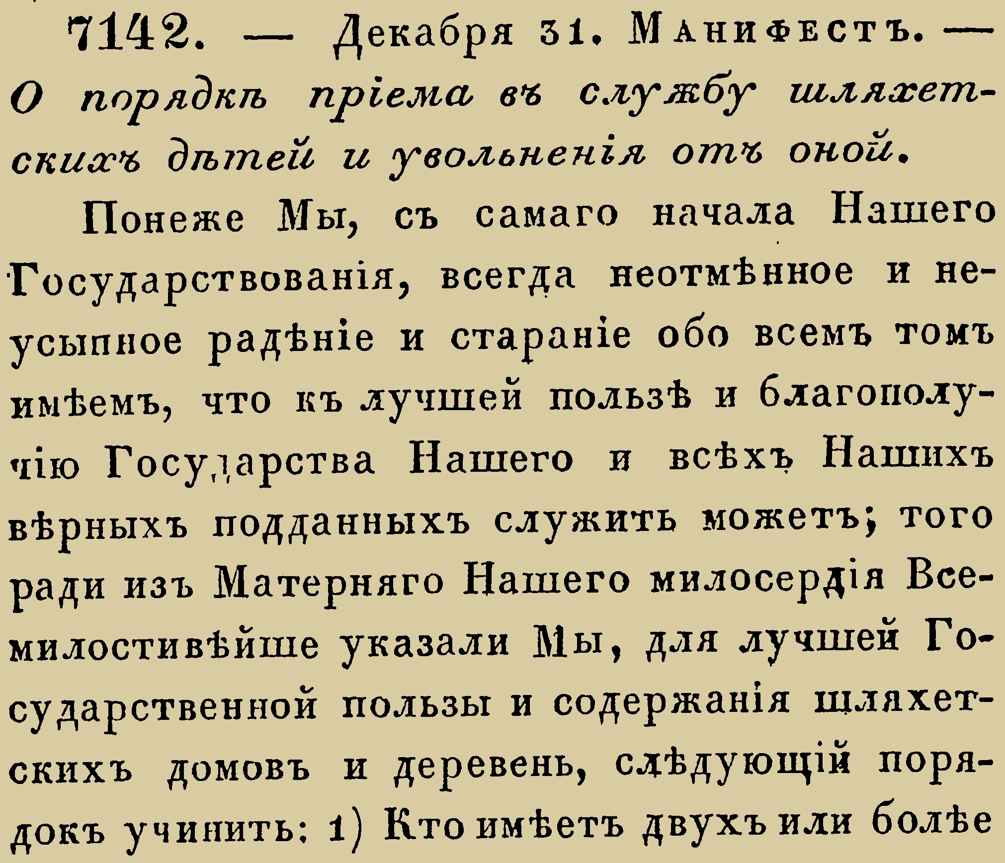 Закон № 7142 - 1736 год, 31 декабря (11 января 1737 года). Манифест о порядке приема на обязательную дворянскую службу и порядке освобождения от нее.