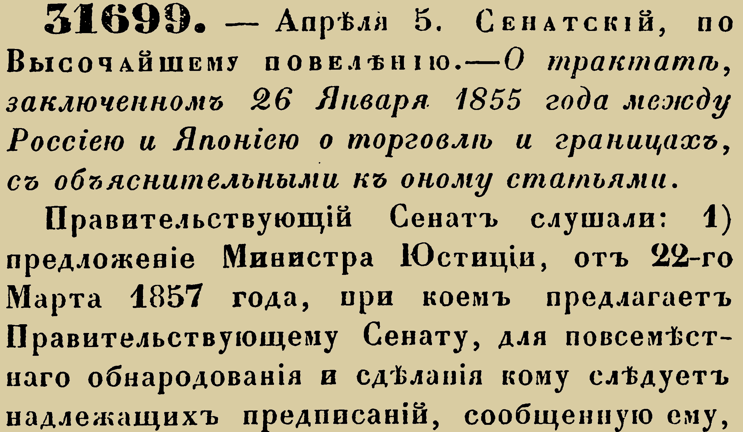Закон № 31699. - 1857 год, 5 апреля (17 апреля). Указ Правительствующего Сената об обнародовании Симодского трактата 1855 года, устанавливающего мирные отношения, государственную границу и правила торговли между Российской империей и Японией.