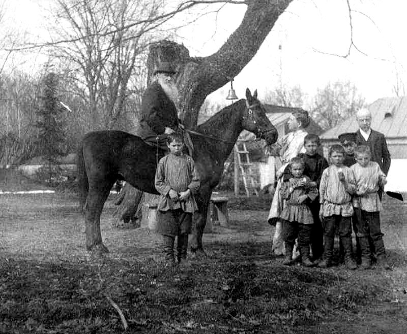 Л. Н. Толстой, С. А. Толстая, Д. П. Маковицкий и крестьянские мальчики у «дерева бедных»