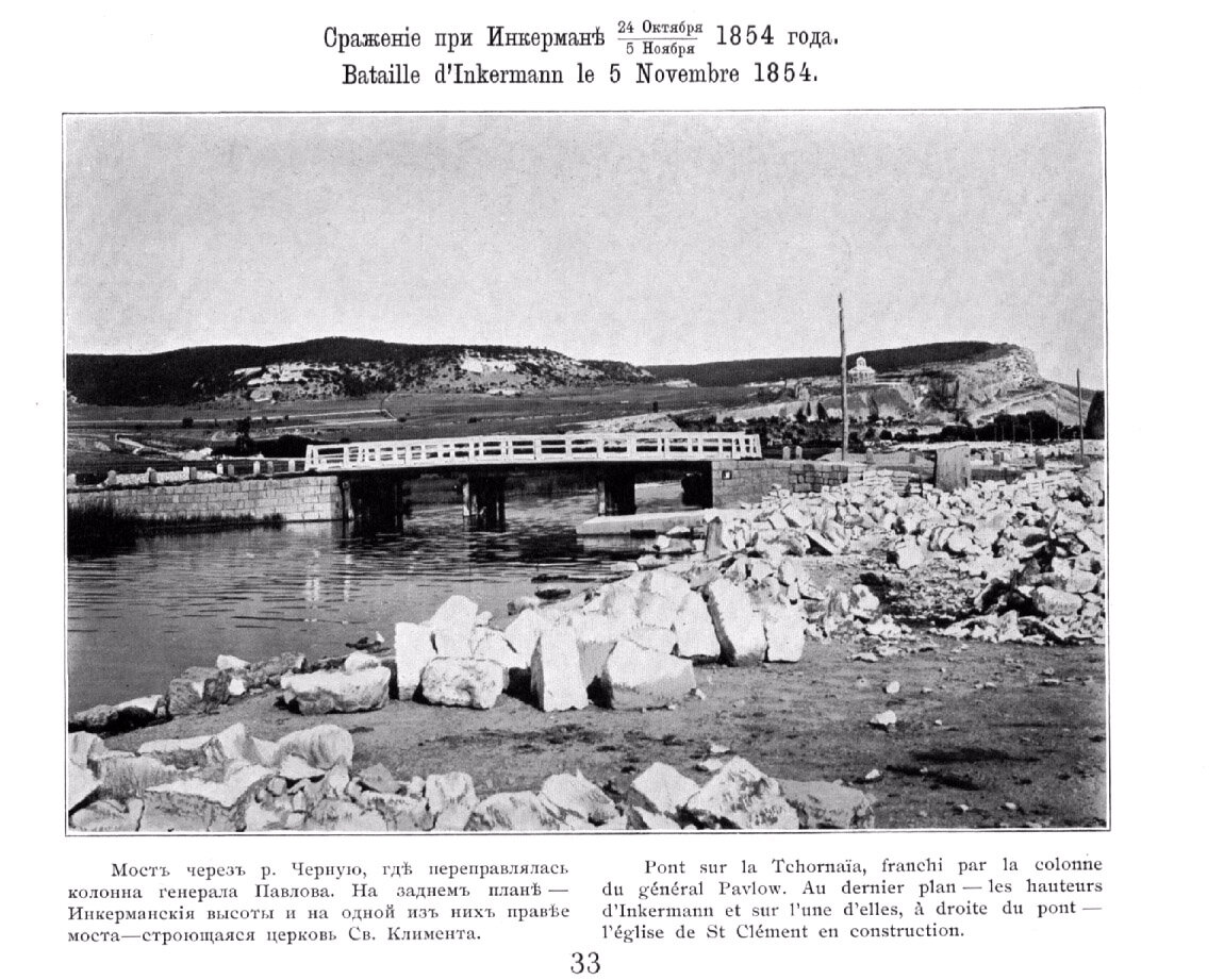 Мост через реку Черную, где переправлялась колонна генерала Павлова. На заднем плане Инкерманские высоты, и на одной из них правее моста — строящаяся церковь Св. Климента.