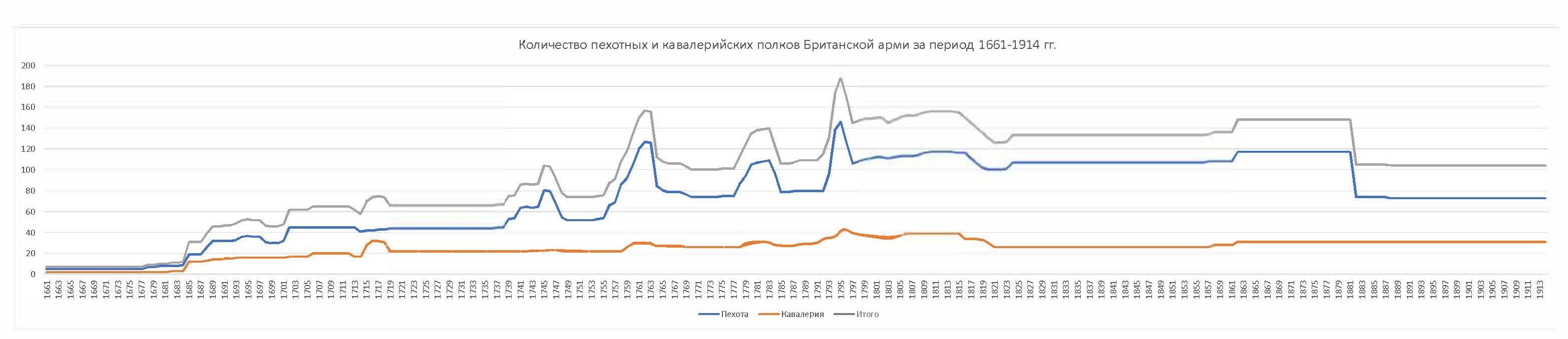 Количество пехотных и кавалерийских полков Британской армии за период 1661-1914 гг.