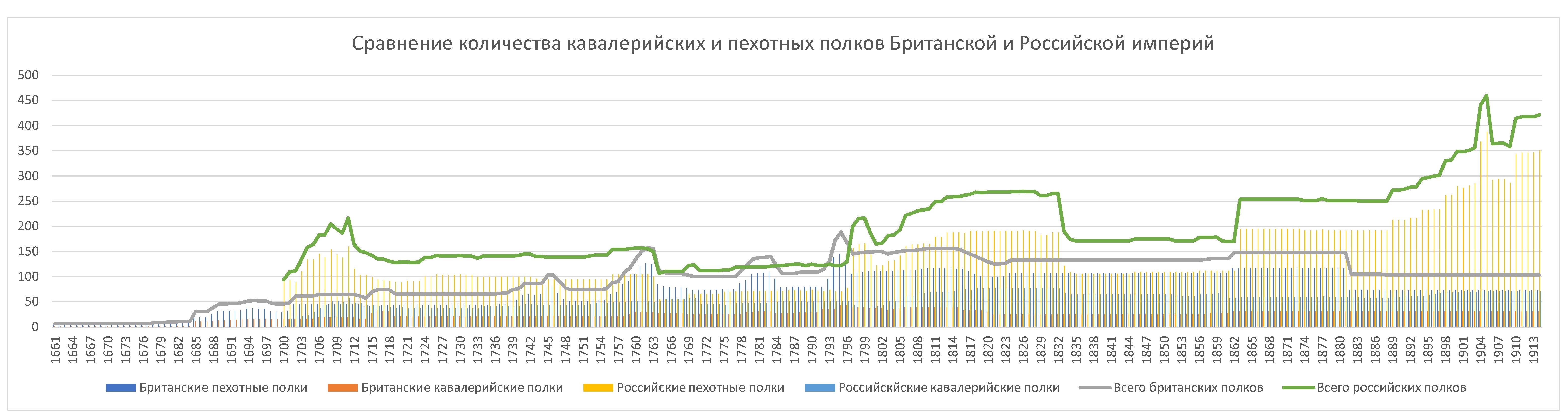 Сравнение количества кавалерийских и пехотных полков Британской и Российской империй