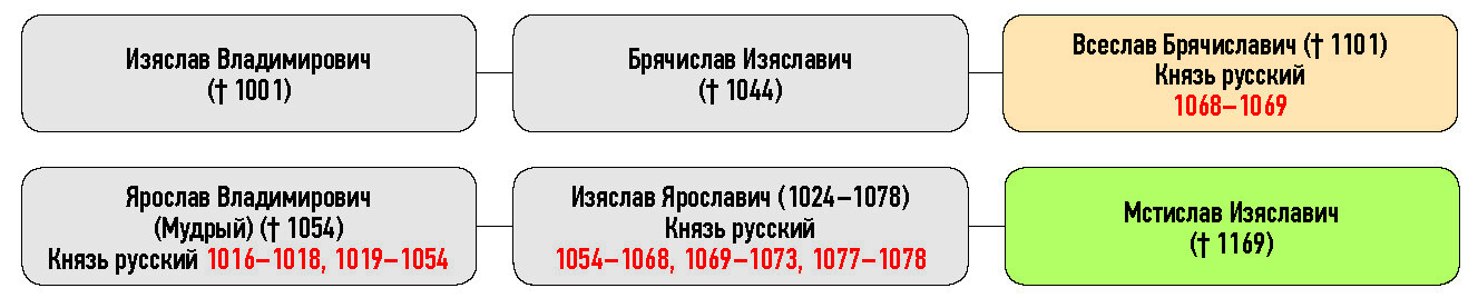Изяслав Владимирович († 1001), Брячислав Изяславич († 1044), Всеслав Брячиславич († 1101) Князь русский, Ярослав Владимирович (Мудрый) († 1054), Изяслав Ярославич (1024–1078) Князь русский, Мстислав Изяславич († 1169)