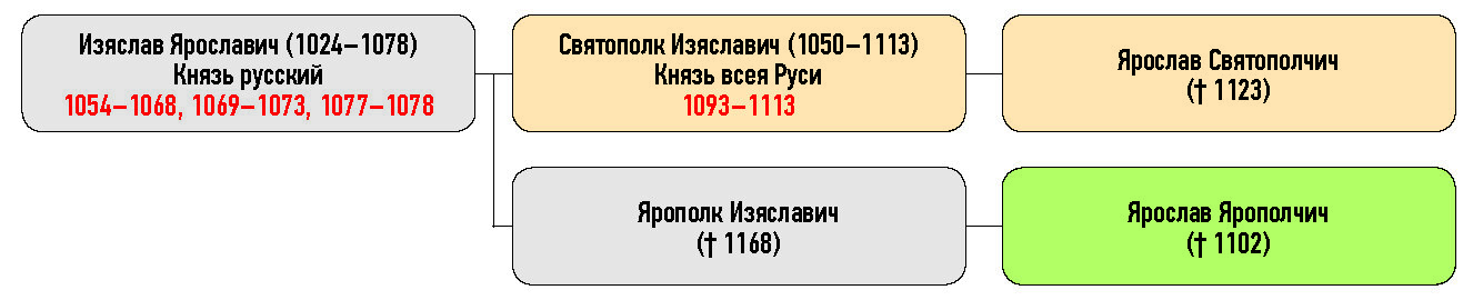 Святополк Изяславич (1050–1113) Князь всея Руси, Изяслав Ярославич (1024–1078) Князь русский, Ярополк Изяславич († 1168), Ярослав Ярополчич († 1102), Ярослав Святополчич († 1123)