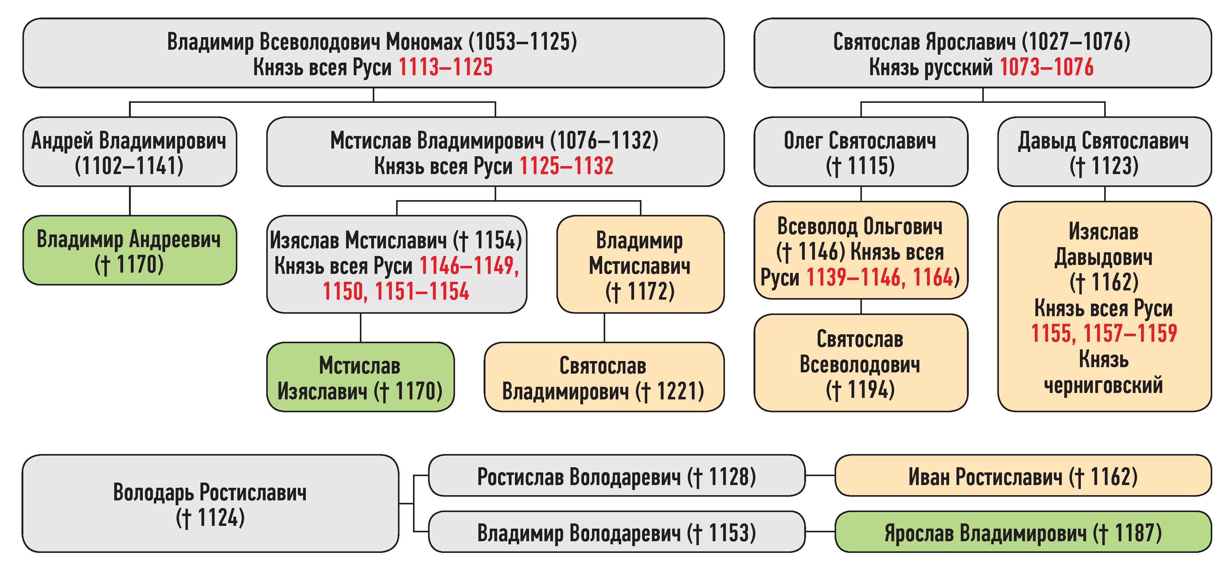 Изяслав Давыдович — сын Давыда Святославича, Иван Ростиславич — сын Ростислава Володаревича, Святослав Всеволодович — сын Всеволода Ольговича, Владимир Мстиславич — сын Мстислава Владимировича, Святослав Владимирович — внук Мстислава Владимировича, Ярослав Владимиркович — сын Владимирка Володаревича, Мстислав Изяславич — сын Изяслава Мстиславича, Владимир Андреевич — сын Андрея Владимировича