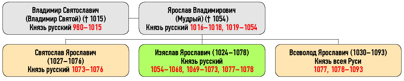 ладимир Святославич (Владимир Святой) († 1015), Ярослав Владимирович (Мудрый) († 1054), Святослав Ярославич (1027–1076), Изяслав Ярославич (1024–1078) Князь русский, Всеволод Ярославич (1030–1093) Князь всея Руси